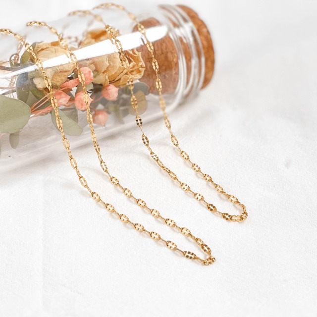 シンプルでつけっぱなしOK、輝きをまとうチェーンネックレス。 肌にやさしく沿う細めのチェーンが、華奢な首元をきれいに引き立ててくれます。 チェーンのみのシンプルなデザインで、ひとつでも十分な存在感です。 小さなパーツが連なったようなペタルチェーンは、 光の反射で自然にキラキラと輝くのが魅力です。 Tシャツやブラウスなど、シンプルな服に合わせるだけでこなれ感を演出できる1本です。 チェーンはサージカルステンレスのため、 肌に優しく、金属アレルギーのある方にも安心してお使いいただけます。 水や汗にも強いため、つけっぱなしでも美しさが長持ち。 夏の暑い日やお風呂でも、外す手間なくおしゃれを楽しめます。 ▼シルバーのネックレスはこちら https://kochawoirete.base.shop/items/104435800 ―――――――――――――――――――― 【ネックレス】 サイズ:35㎝、40㎝、45㎝、50㎝ 材質:サージカルステンレス(SUS316L) ※ゴールド:ニッケルフリーメッキコーティング 【留め具】 通常:カニカン(サージカルステンレス) オプション:マグネット(サージカルステンレス) 【アジャスター】 サイズ:約5㎝ 材質:サージカルステンレス(SUS316L) ※ゴールド:ニッケルフリーメッキコーティング ―――――――――――――――――――― ◼️金属アレルギー対応 チェーンと金具はサージカルステンレス(316L)を使用しており、 比較的アレルギーが起きにくい素材です。 さらに発送前にアレルギー防止用のコーティング剤を塗っているため より安心して身に着けられます。 ◼️お手入れ方法 サージカルステンレス製なので、基本的に特別なお手入れは不要です。 汚れが気になる場合は、水で軽くすすいで柔らかい布で拭き取ると、より長くきれいに使えます。 温泉や塩素の強いプールでは、変色を防ぐために外すのがおすすめです。