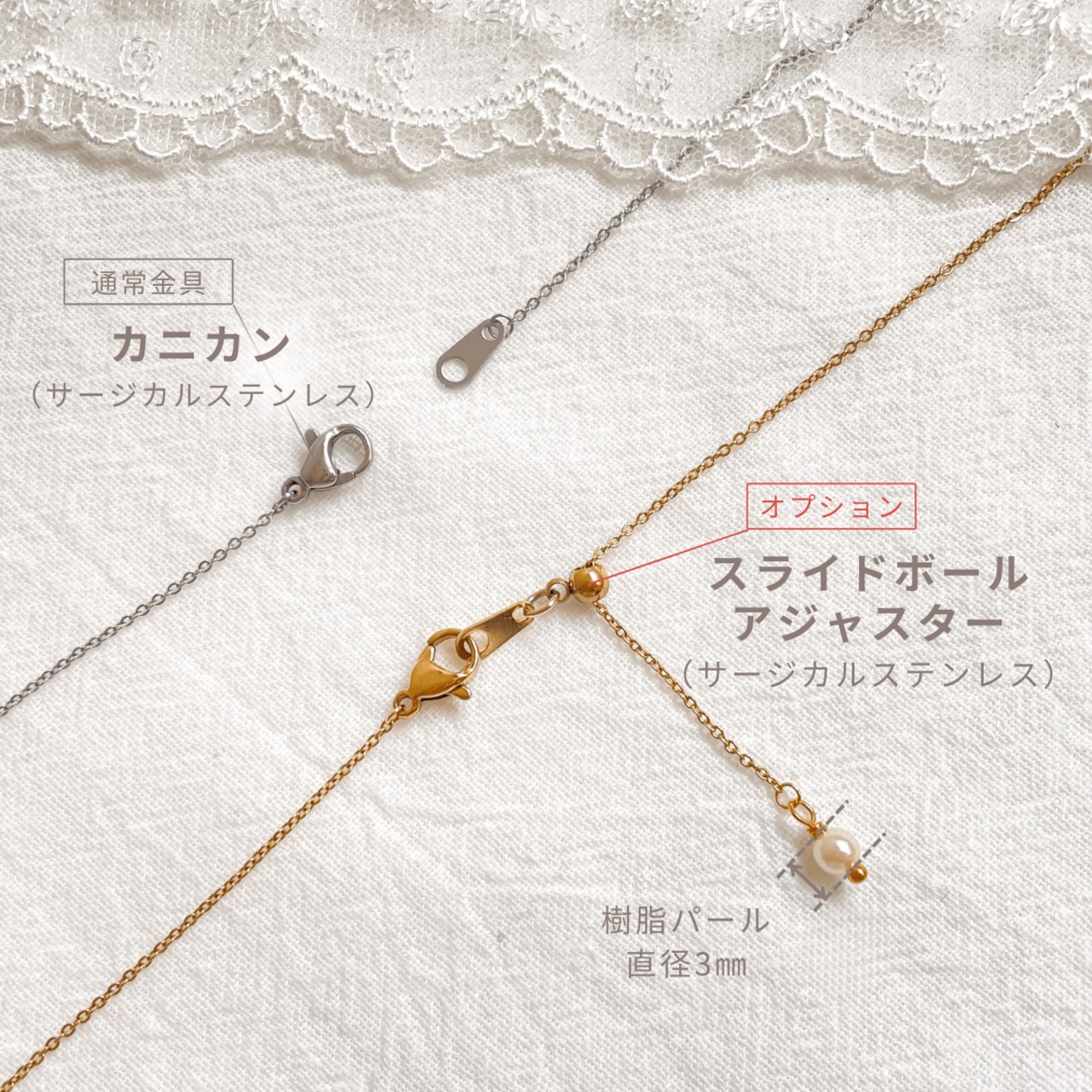 チェーンと金具はサージカルステンレス(316L)を使用しており、