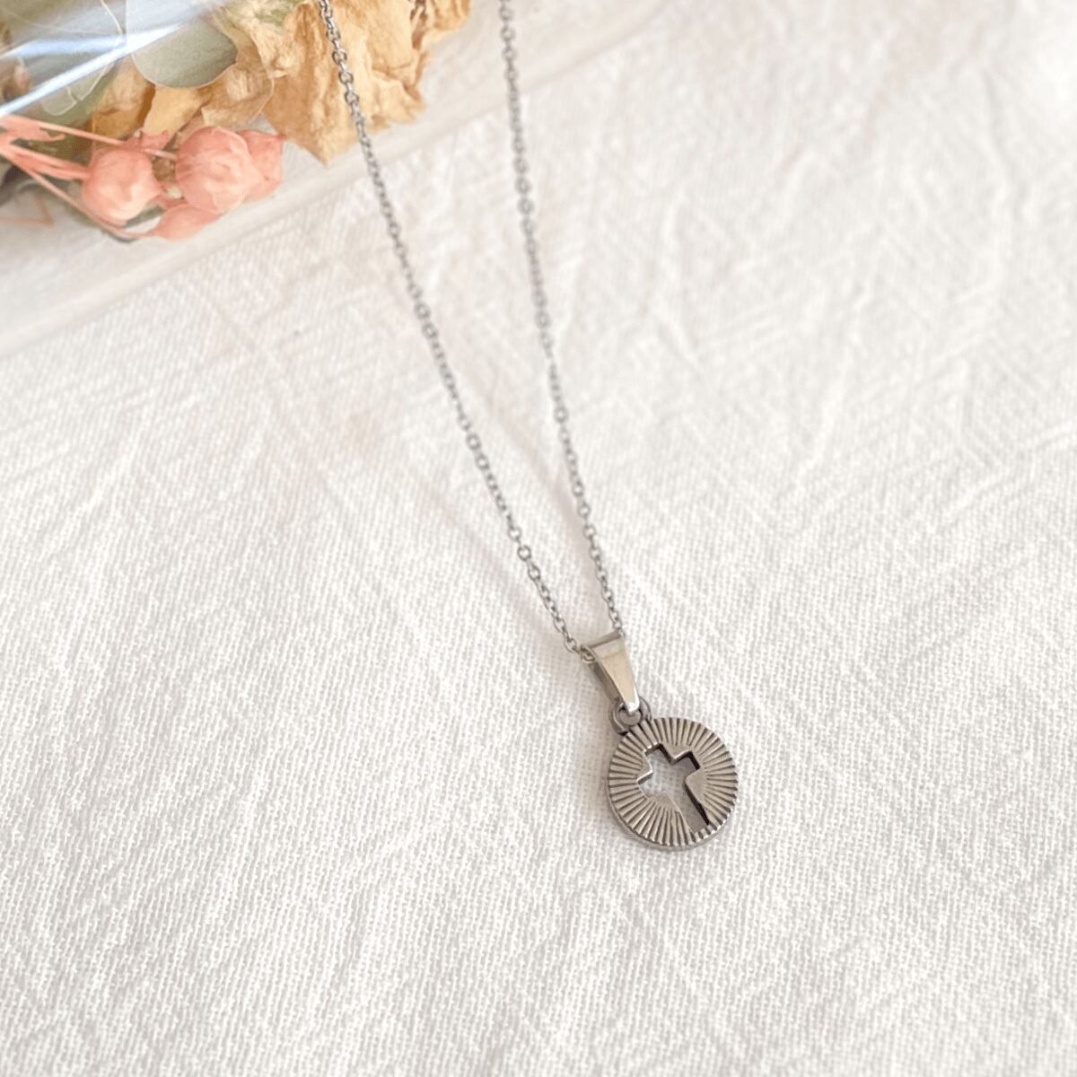 シンプルなコイン×クロスのデザインをつけっぱなしで楽しめるネックレス。