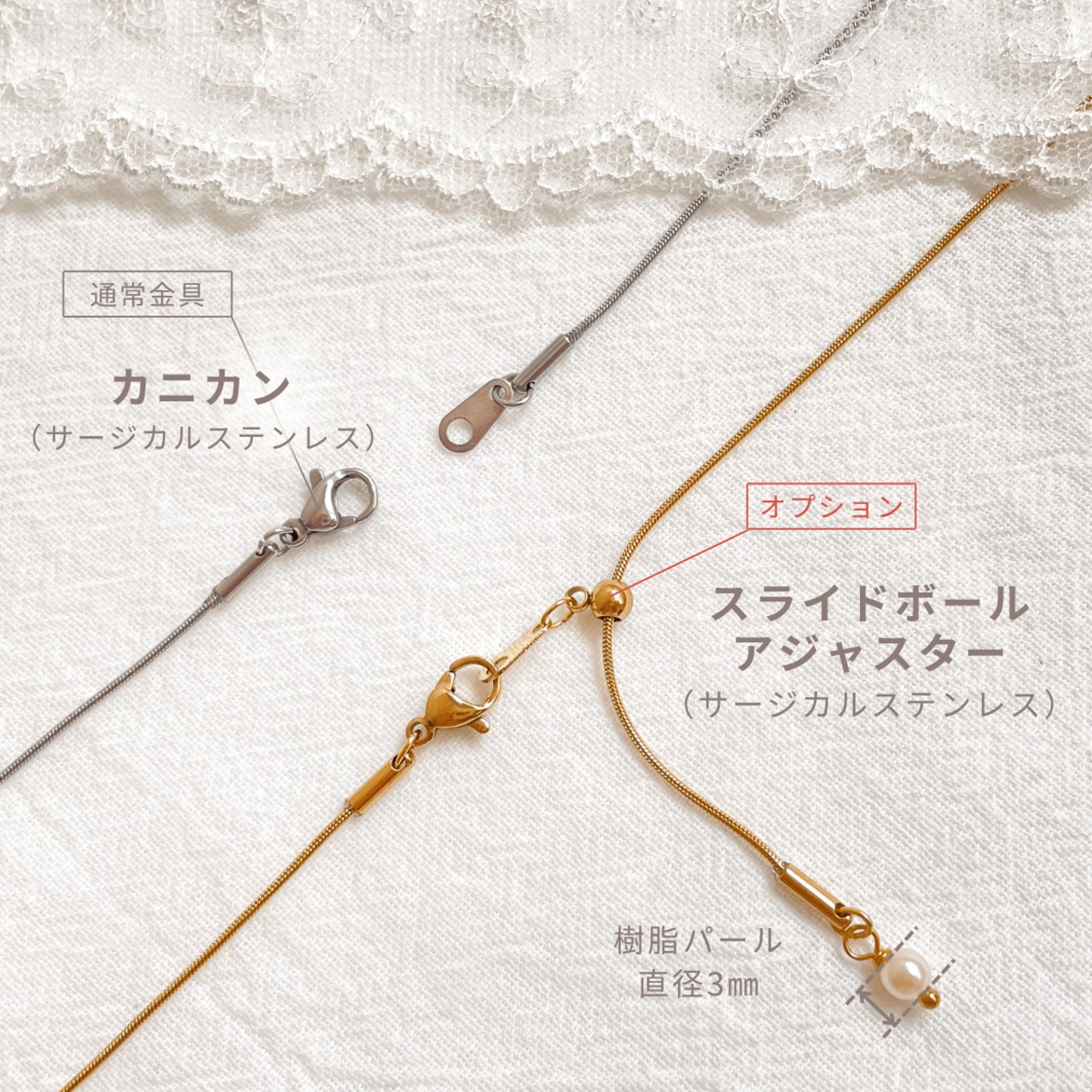 チェーンと金具はサージカルステンレス(316L)を使用しており、