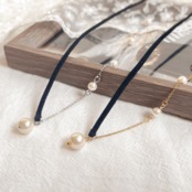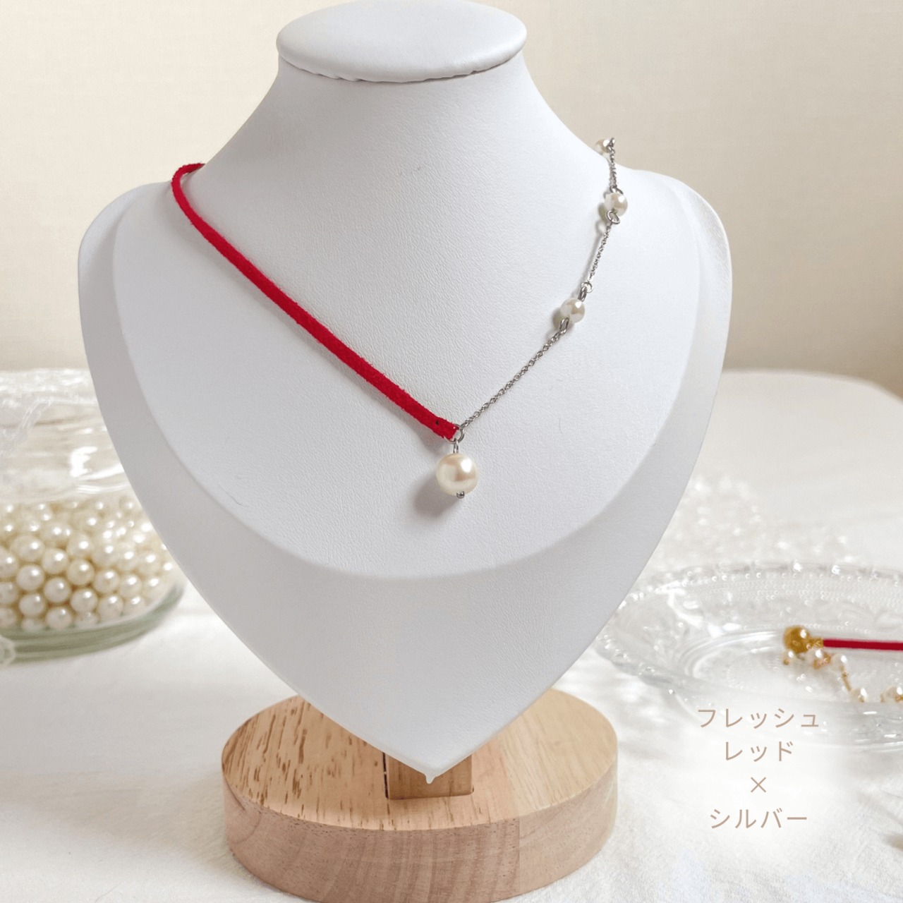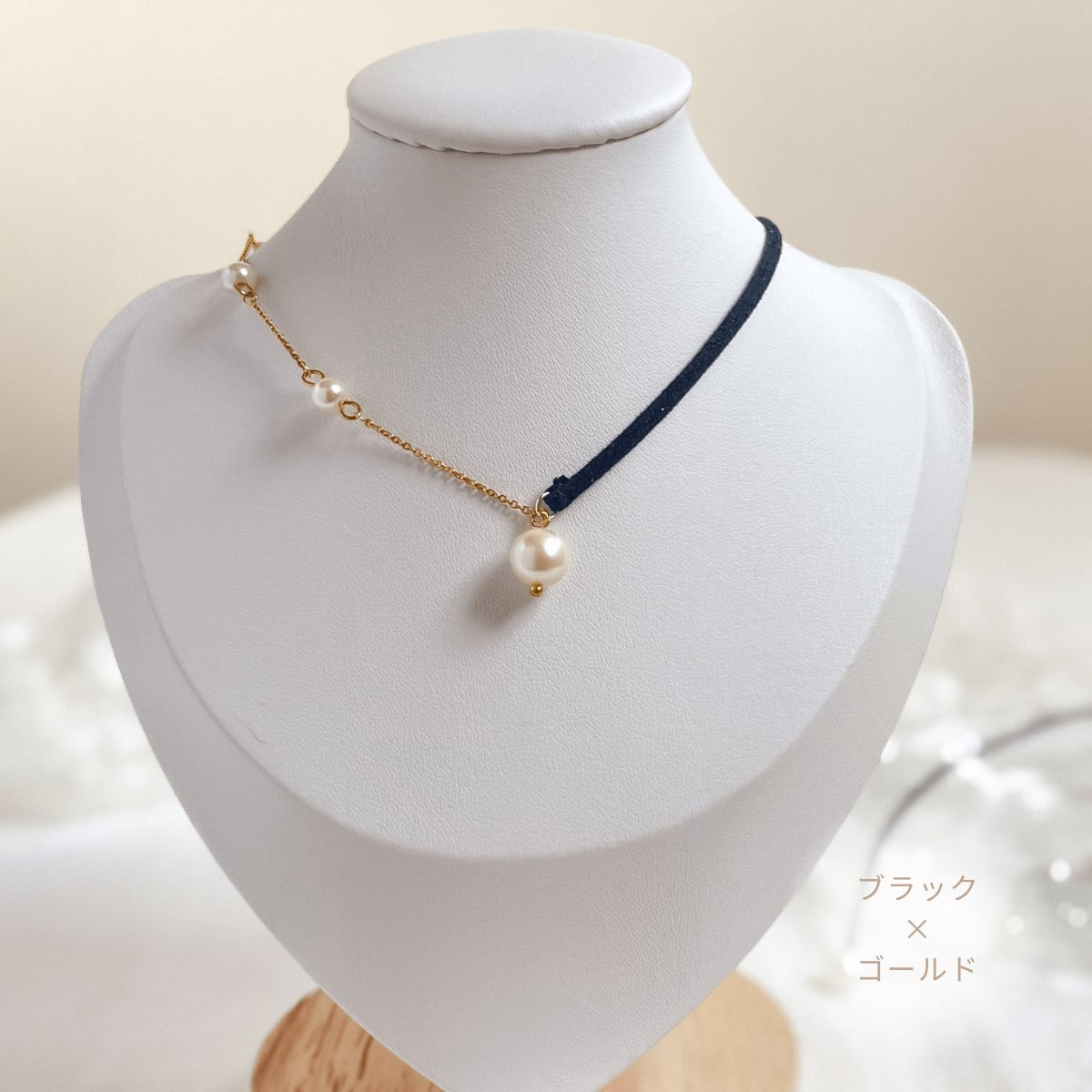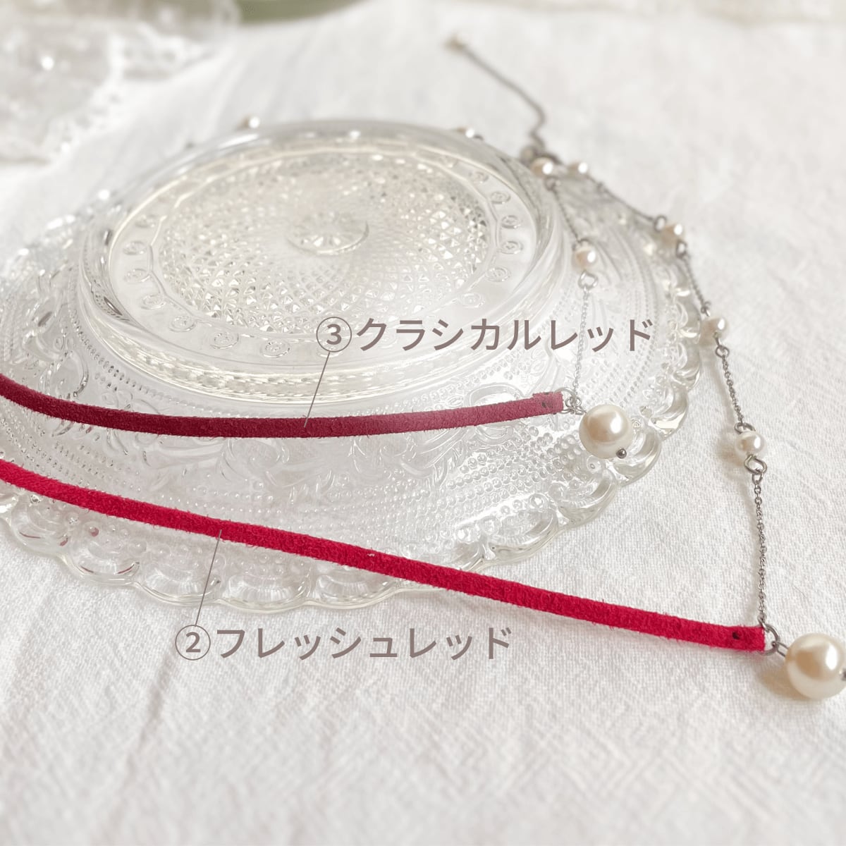 首元にやさしく沿う、2mm幅のスエード紐と華奢なチェーン。