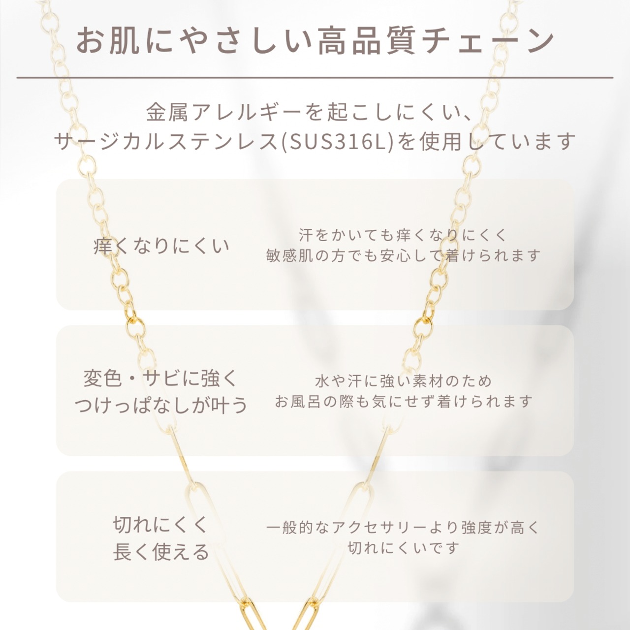 チェーンと金具はサージカルステンレス(316L)を使用しており、