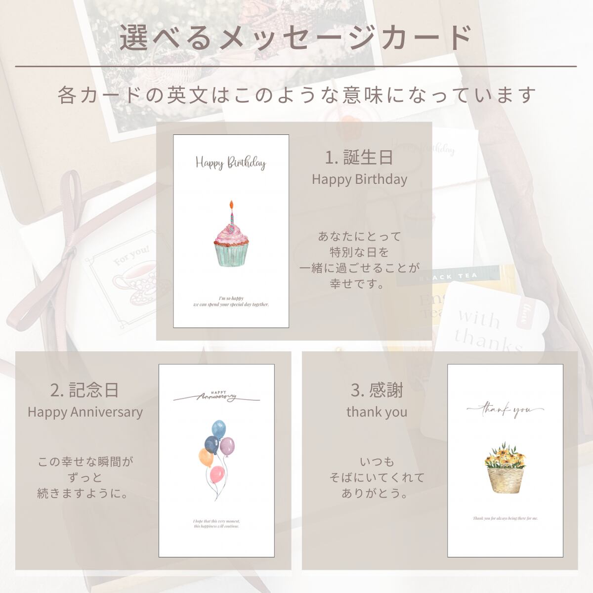 ・メッセージカード(「誕生日」「記念日」「感謝」からお選びいただけます)