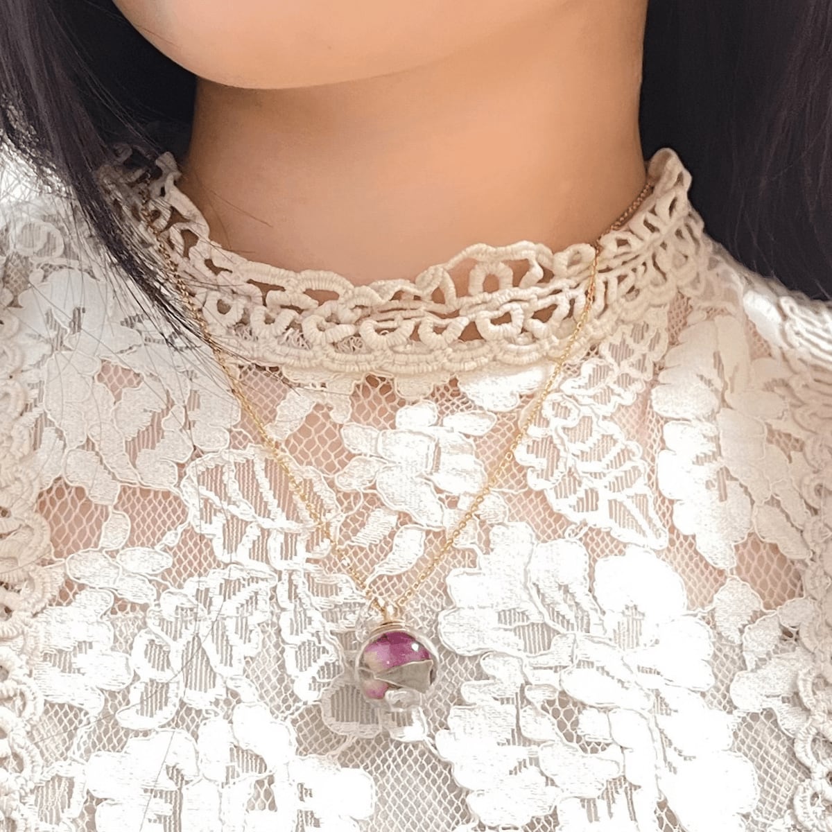 まるで透明なガラスのティーポットに、芳醇なバラの茶葉を閉じ込めたようなデザインのサージカルステンレスネックレス。
